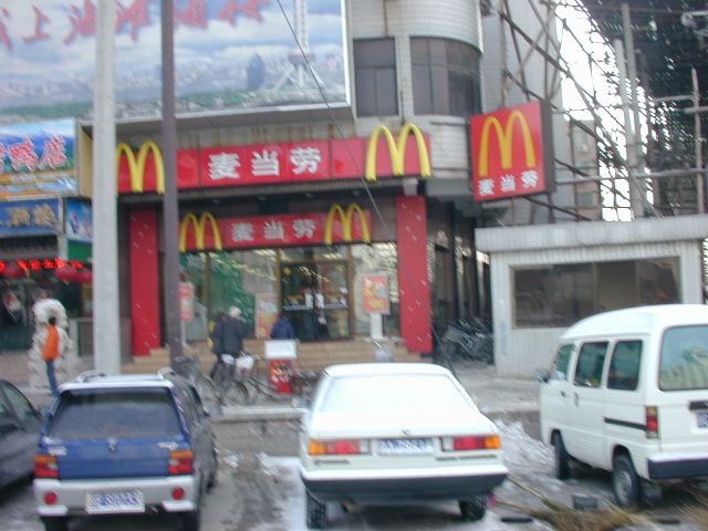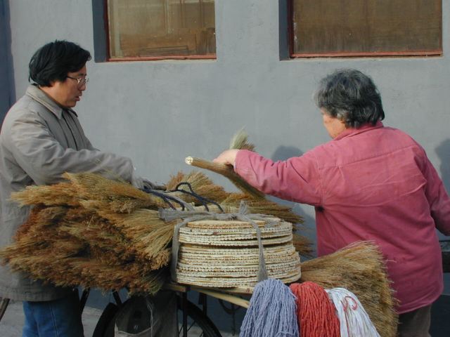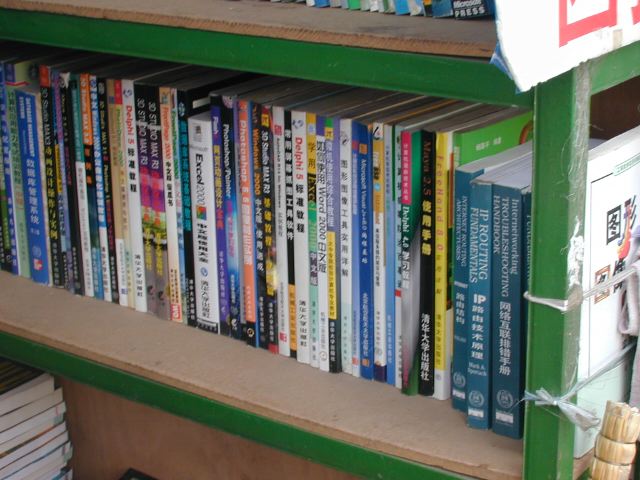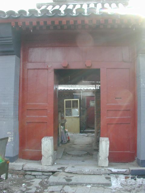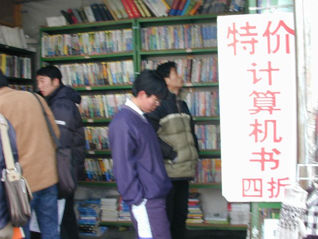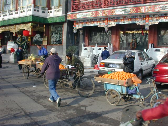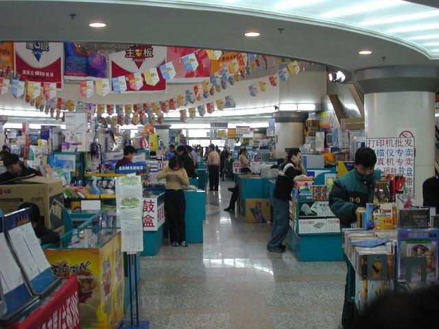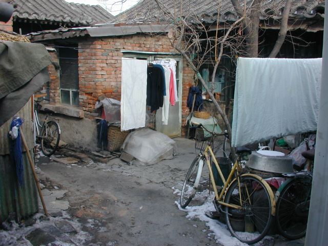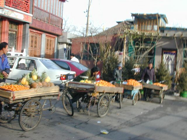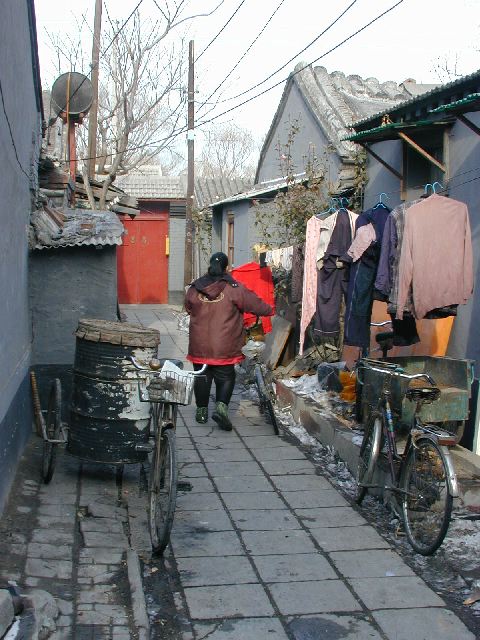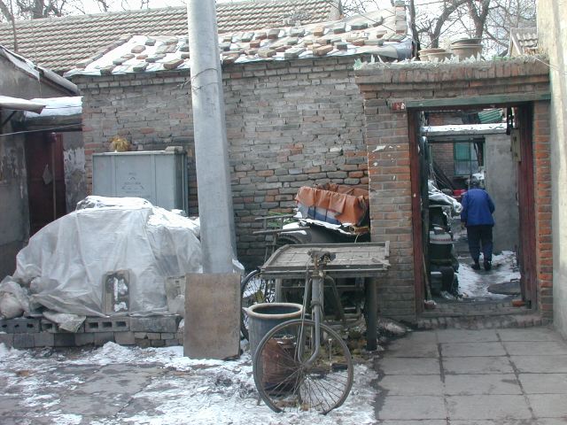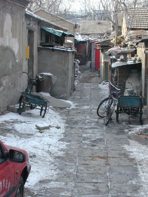 But amonst all this there are still the people cycling with heavy loads on bicycles, trailers and other contraptions. It seems a very mixed society. We walked to an area near the campus called Haidian which is renowned for it's computer shops, most of which are in a giant building with a sort of computer market inside. There are also many cafés including the internet sort. But on the way we passed through many narrow lanes of the old sort with little shops.