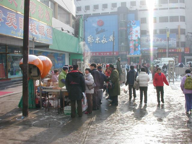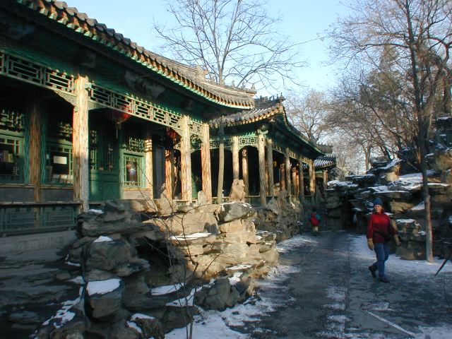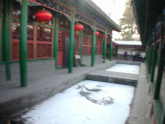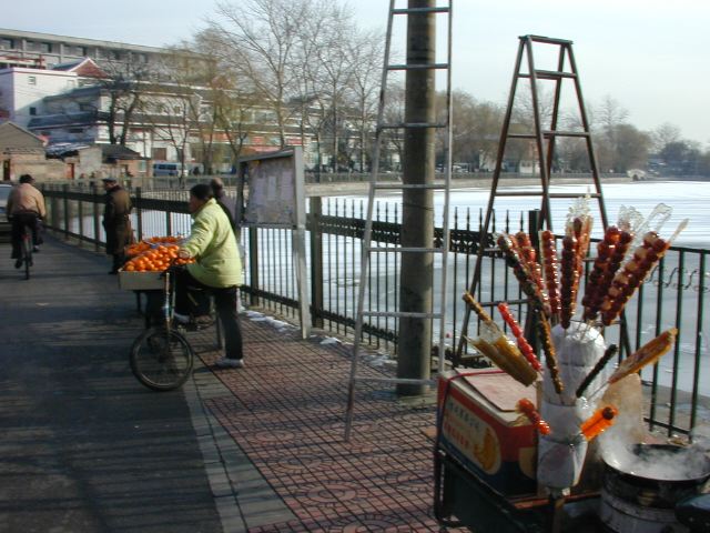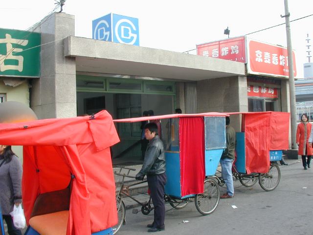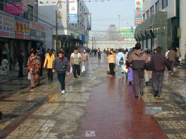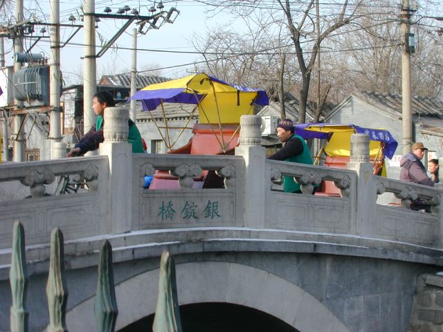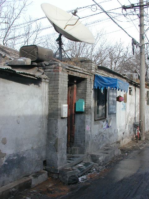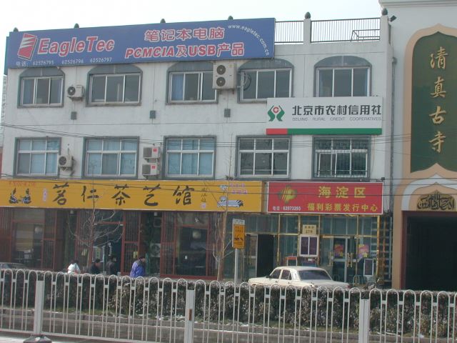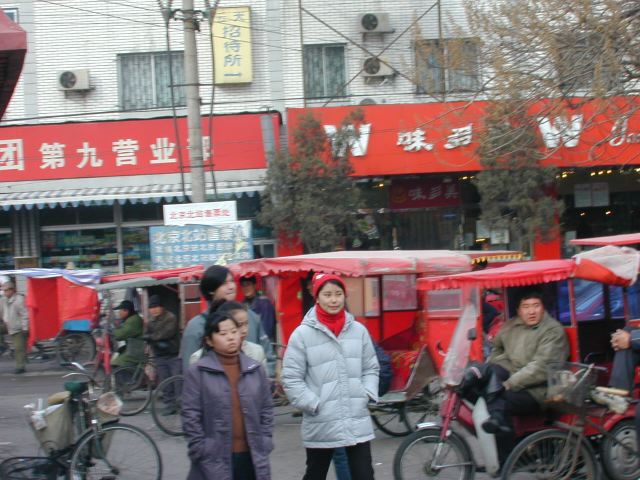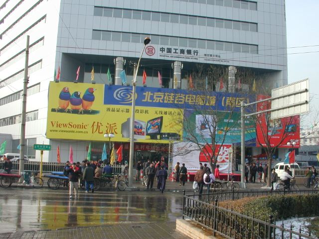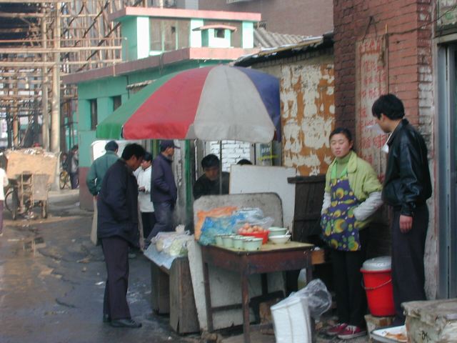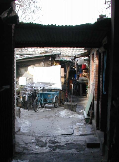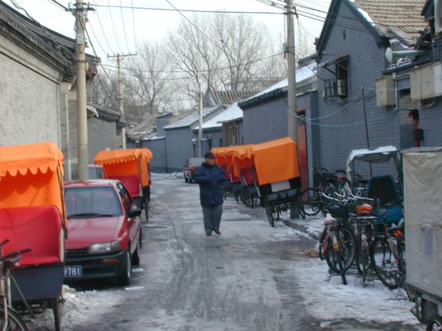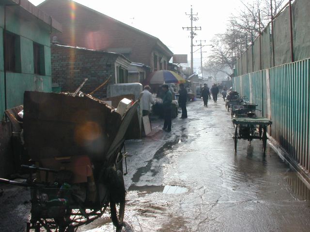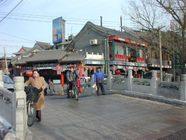 But amonst all this there are still the people cycling with heavy loads on bicycles, trailers and other contraptions. It seems a very mixed society. We walked to an area near the campus called Haidian which is renowned for it's computer shops, most of which are in a giant building with a sort of computer market inside. There are also many cafés including the internet sort. But on the way we passed through many narrow lanes of the old sort with little shops.